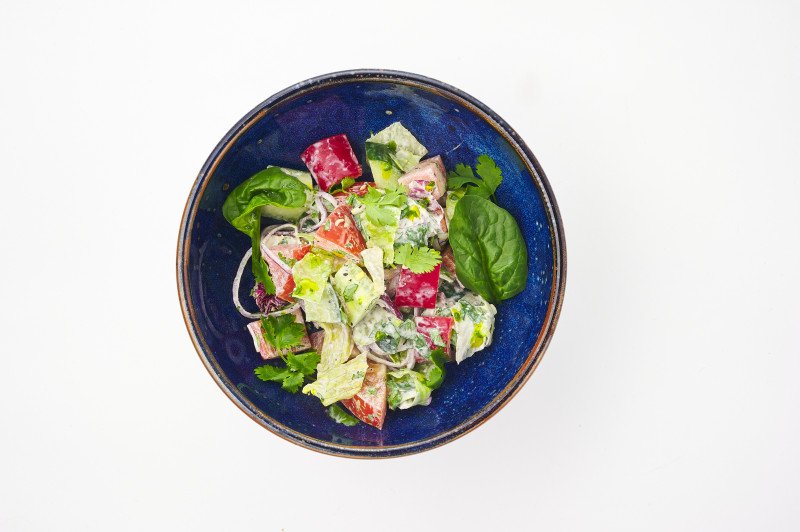 Огурец, помидор, перец болгарский, сливочная заправка с добавлением кинзы и орехов