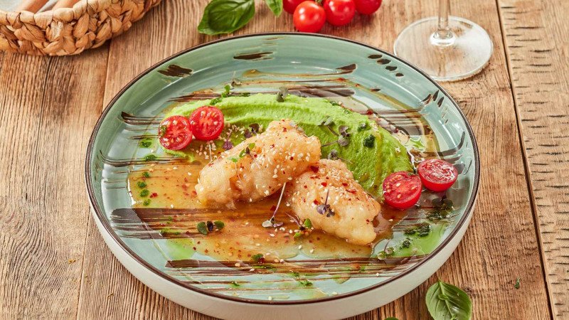 Филе трески, пюре из зелёного горошка, томаты черри Подача блюда при доставке может отличаться от изображения на сайте.