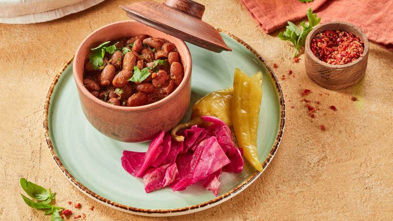 Красная фасоль с пряными травами. Подаётся с домашними солениями Подача блюда при доставке может отличаться от изображения на сайте.