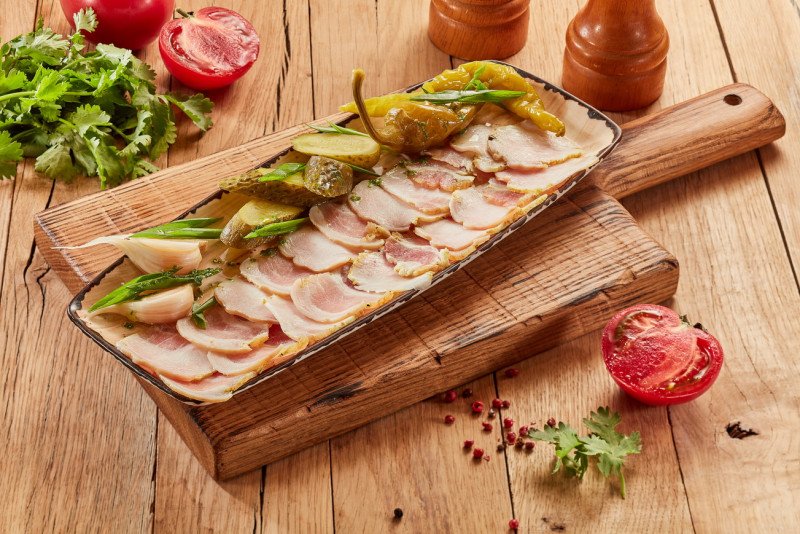 Сало солёное, маринованные овощи Подача блюда при доставке может отличаться от изображения на сайте.